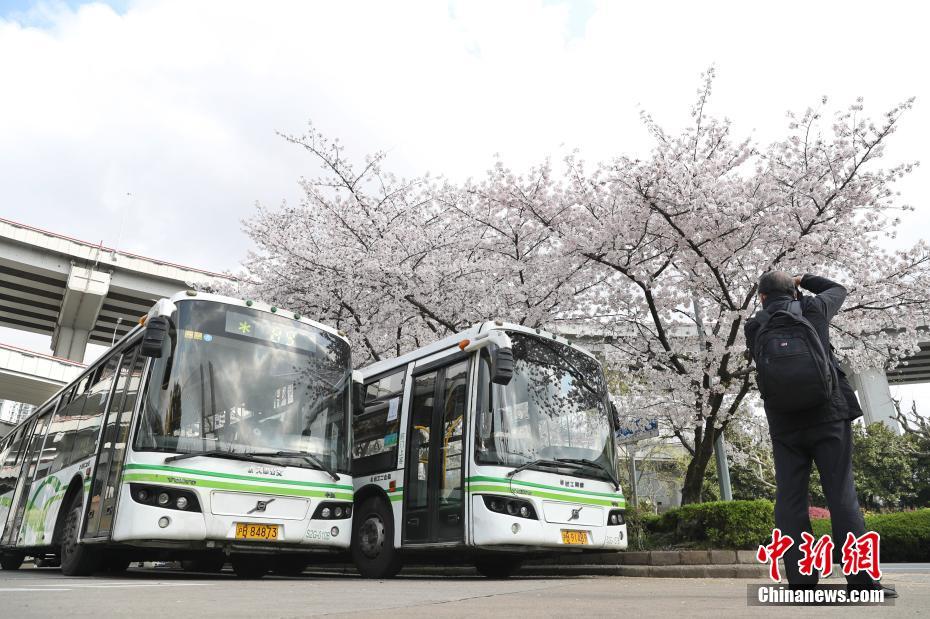3月31日,位于上海南浦大桥下的“樱花车站”迎来烂漫季节,市民在樱花树下驻足拍照。中新社记者 张亨伟 摄