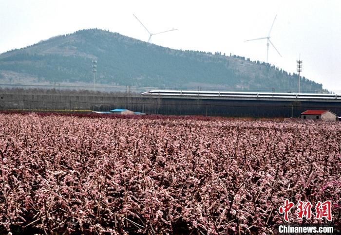 京沪高铁列车在桃花海中飞驰。 朱志庚 摄