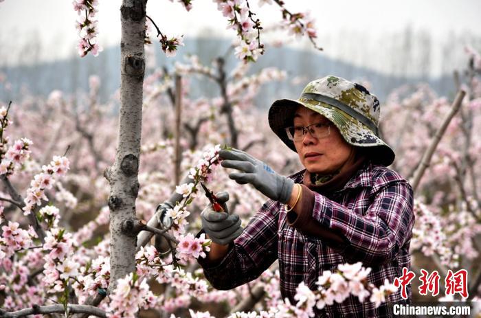 桃农在花海之中忙碌。 朱志庚 摄