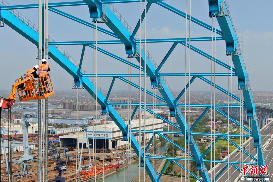 4月2日,工作人员在天生港航道桥高空中为吊索安装压力环传感器,通过传感器感应拱桥吊索的受力情况后进行调索。预计4月10日前完成全部调索。图为工作人员“高空调索”忙。 许丛军 摄