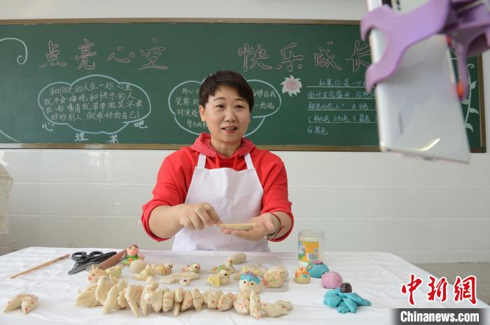 4月3日,老师通过手机录制视频,向小学生们展示面塑寒燕的制作过程。 刘文华 摄