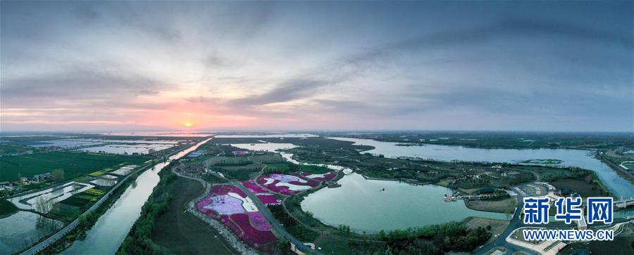 这是4月6日拍摄的白马湖风光(无人机全景照片)。 近日,江苏省淮安市白马湖畔春花绽放,景色怡人。白马湖地处淮河流域下游,东贯大运河,西倚洪泽湖,南北分别衔接淮河入江水道和入海水道,湖泊水域面积113平方公里,是全国15个生态良好重点保护湖泊之一。 新华社记者 杨磊 摄