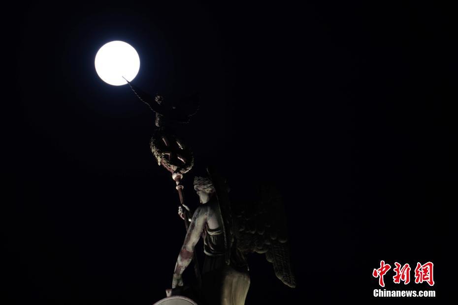 当地时间4月7日21时许,德国柏林夜空可清晰地观赏到今年的“超级月亮”。图为在柏林勃兰登堡门看到的“超级月亮”。中新社记者 彭大伟 摄