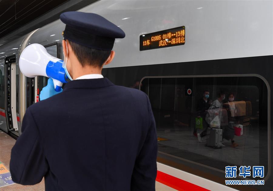 4月8日,武汉始发的首趟入粤旅客列车G1005次列车抵达广州南站。 当日中午,武汉市正式解除离汉离鄂通道管控措施后,武汉始发的首趟入粤旅客列车G1005次列车抵达广州南站。G1005次列车从武汉站始发,终点站为深圳北站。 新华社记者刘大伟摄