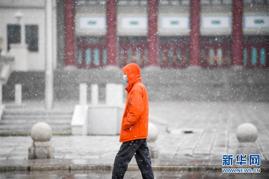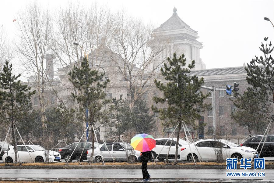 4月8日,一位市民在雪中行走在长春市文化广场上。 当日,吉林省长春市迎来降雪天气。 新华社发 (颜麟蕴 摄)