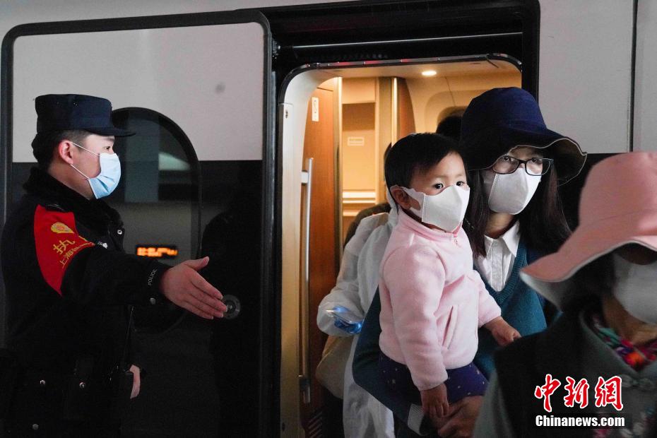 4月8日,武汉“解封”后,由武汉站开往上海虹桥站的首趟列车G1722次列车驶入站台。图为铁路公安民警引导旅客有序下车。 刘少杰 摄