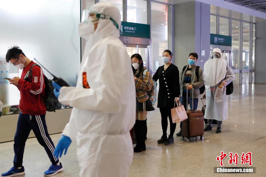 4月8日,武汉“解封”后,由武汉站开往上海虹桥站的首趟列车G1722次列车驶入站台。图为旅客抵达铁路上海虹桥站等待进行体温检测。 殷立勤 摄