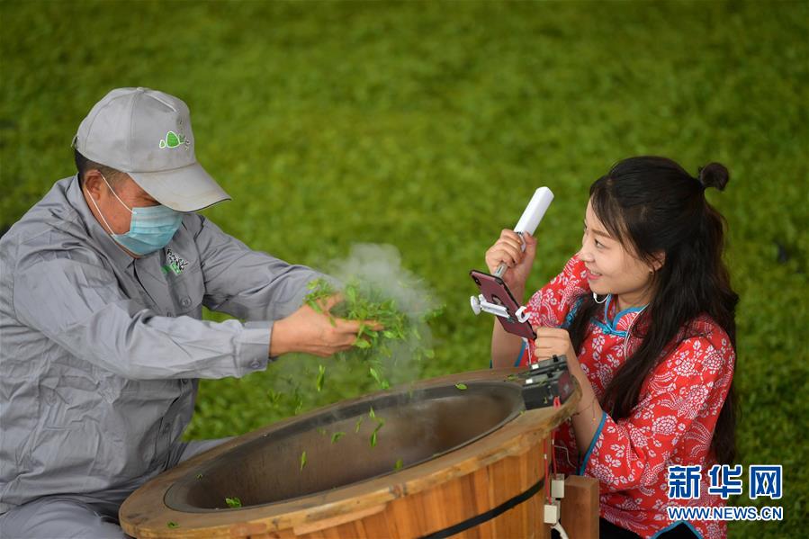 4月8日,鹤峰县鑫农茶业有限公司工作人员田玉妙直播制茶师炒茶。 为促进湖北省鹤峰县40万亩生态茶园的茶叶销售,近日,当地多家茶企积极与电商平台对接,通过直播的方式,向消费者直观呈现茶叶采摘到生产制作的全过程,助力“带茶出山”,帮助茶农脱贫增收。 新华社发(杨顺丕摄)