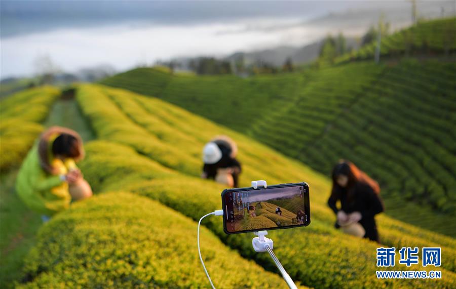 4月9日,鹤峰县鑫农茶业有限公司工作人员直播采茶。 为促进湖北省鹤峰县40万亩生态茶园的茶叶销售,近日,当地多家茶企积极与电商平台对接,通过直播的方式,向消费者直观呈现茶叶采摘到生产制作的全过程,助力“带茶出山”,帮助茶农脱贫增收。 新华社发(杨顺丕摄)