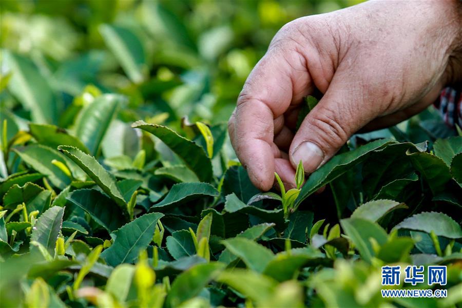 4月9日,茶农在羊艾茶园内采茶。 清明过后,位于贵州省贵安新区的羊艾茶园春色怡人,呈现出一幅美丽的春季画卷。 新华社记者 欧东衢 摄