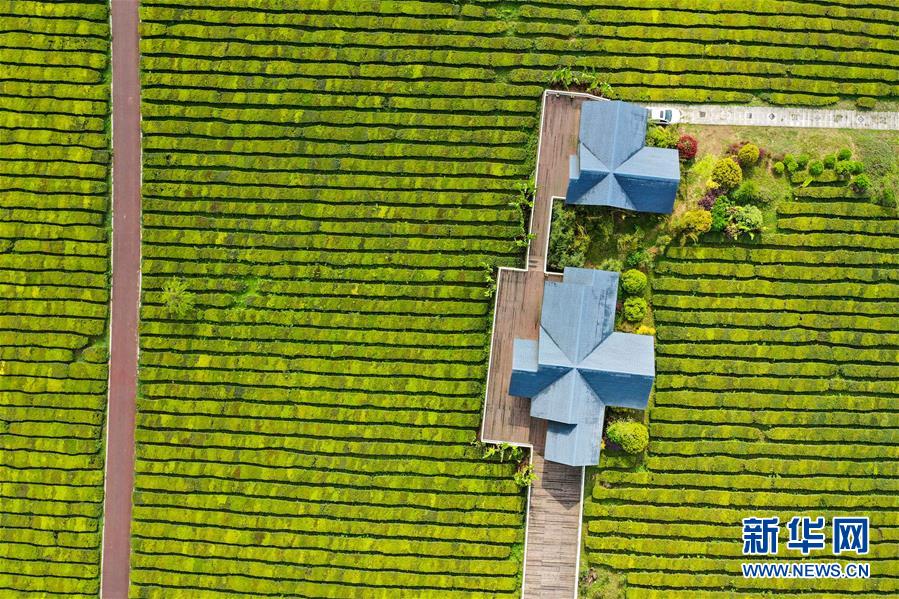 4月9日拍摄的羊艾茶园风光(无人机照片)。 清明过后,位于贵州省贵安新区的羊艾茶园春色怡人,呈现出一幅美丽的春季画卷。 新华社记者 欧东衢 摄