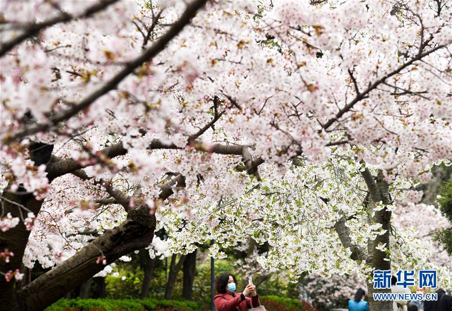 4月9日,市民游客在青岛市中山公园樱花大道上拍照。 进入四月,山东省青岛市中山公园迎来樱花期,樱花大道两侧数千株单樱、双樱次第开放,花团锦簇,灿若云霞。 新华社记者 李紫恒 摄