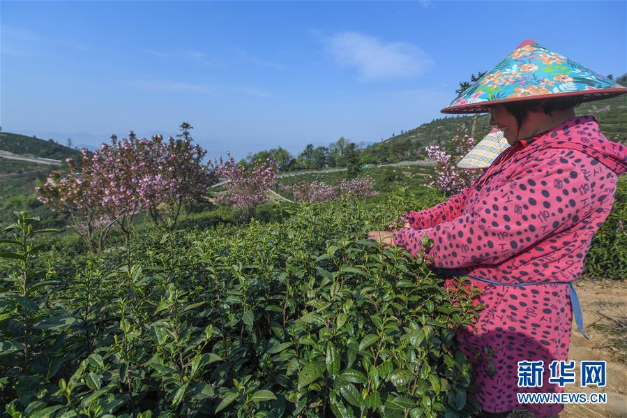4月10日,茶农在里山镇安顶村的高山茶园采摘安顶云雾茶。新华社记者 徐昱 摄