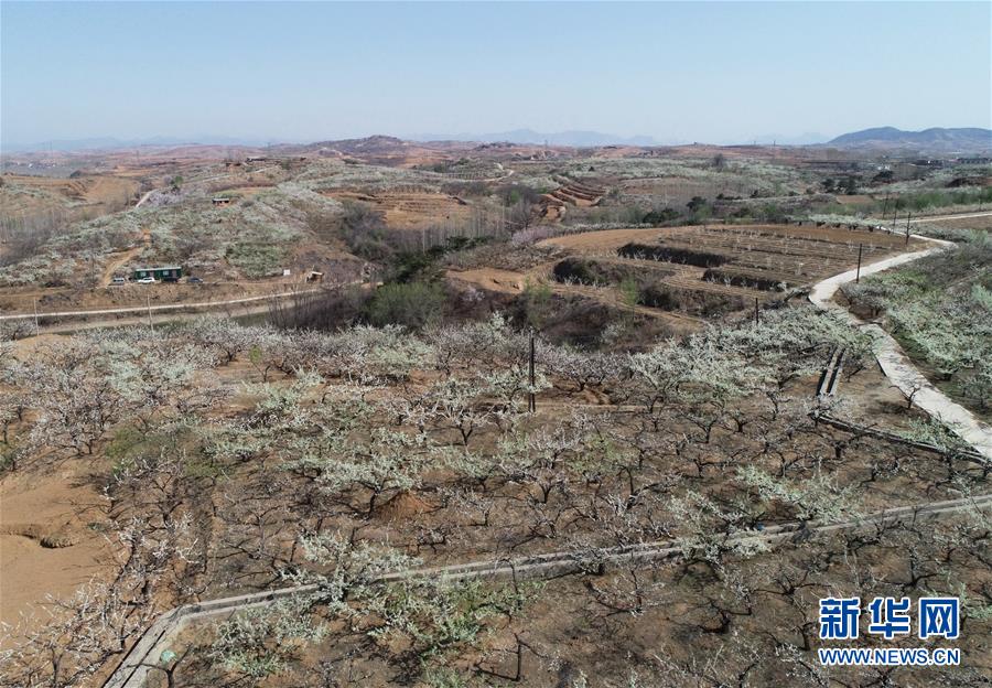 4月10日,卢龙县印庄乡段家沟村李子花盛开的果园(无人机照片)。 近日,地处燕山脚下的河北省卢龙县印庄乡的1万多亩李子树相继开花,呈现出一幅美丽画卷。 新华社记者杨世尧摄