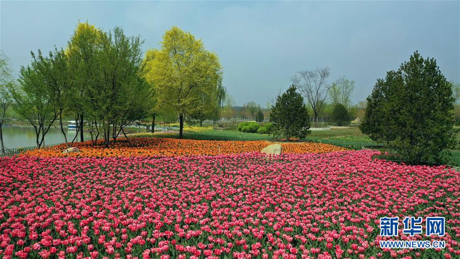 这是4月16日在天津市蓟州区国色天香牡丹园内拍摄的郁金香(无人机照片)。 近日,天津市蓟州区国色天香牡丹园的郁金香竞相绽放。 新华社记者马平摄