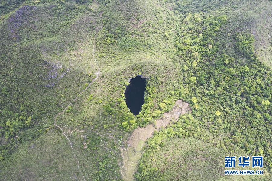 这是4月19日拍摄的中国乐业—凤山世界地质公园内的天坑(无人机照片)。新华社记者 曹祎铭 摄
