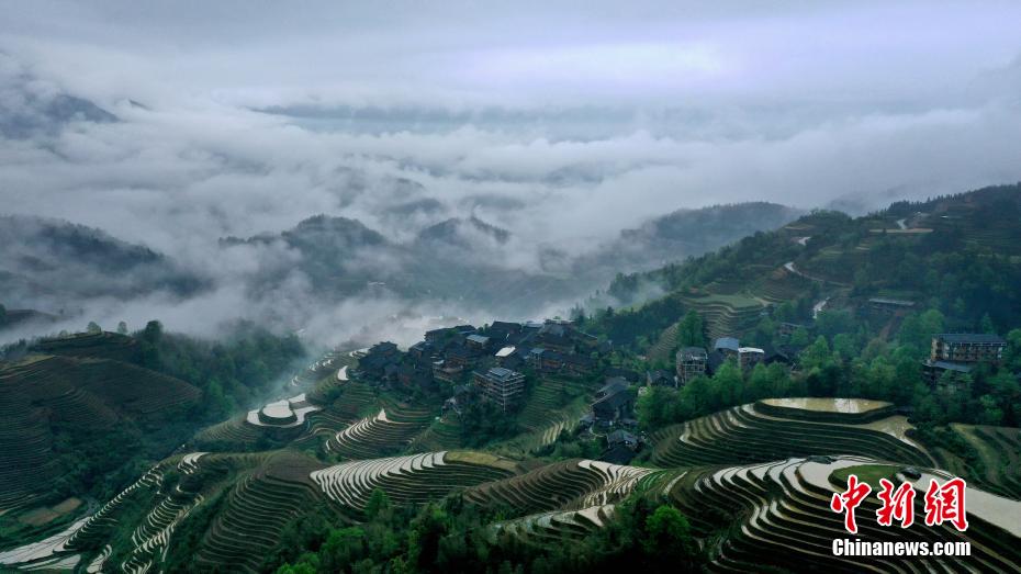 4月19日,在广西桂林市龙胜各族自治县龙脊梯田景区拍摄的梯田景观。连日来,当地村民抢抓雨水充沛的好时节,开展犁田、注水、耙田、扶田基等农活,仿佛在田间作画,层层梯田上勾勒出了一幅幅美丽的春耕图景。 潘志祥 摄