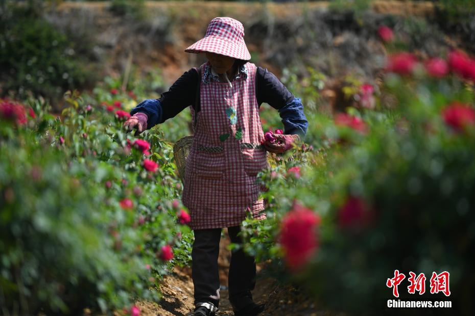 4月21日,云南省安宁市八街街道,花农正在采摘食用玫瑰。近日,八街的食用玫瑰开始进入采摘季。据了解,八街食用玫瑰种植面积已超9600亩,是云南省规模最大的食用玫瑰生产基地,也是云南省唯一获得食用玫瑰国家地理标识认证的种植基地。中新社记者 刘冉阳 摄