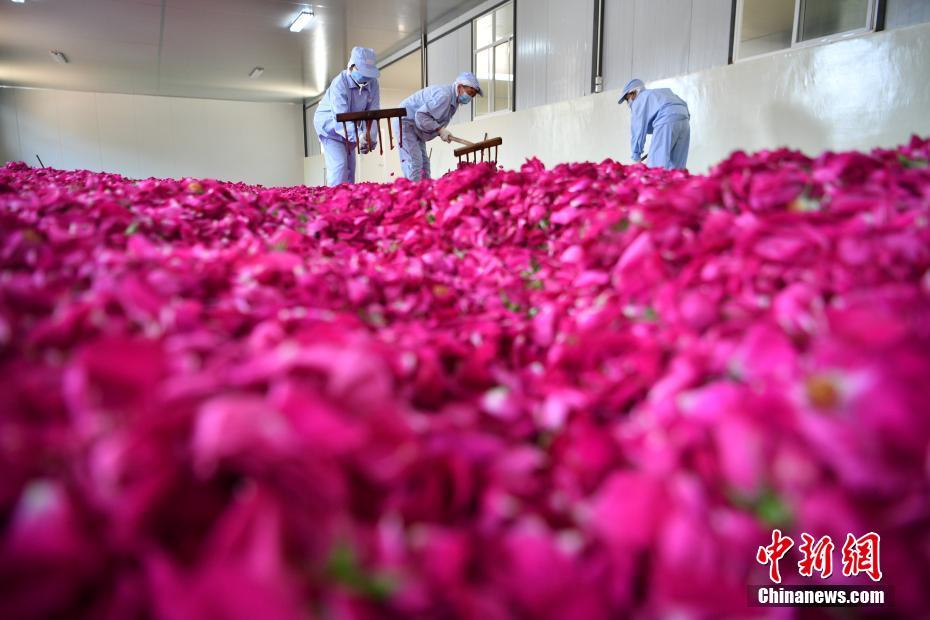 4月21日,云南省安宁市八街街道一玫瑰花加工厂内,工人在原料车间工作。近日,云南省安宁市八街街道的食用玫瑰进入采摘季,玫瑰花加工企业也开始逐渐忙碌。据了解,八街街道已建成食用玫瑰现代化生产标准化流水线10余条,主要生产玫瑰糖、玫瑰馅料、玫瑰鲜花饼、玫瑰香皂、玫瑰饮料等数十个品种,玫瑰花种植面积近万亩,年出产鲜花约4500吨,产值约6750万元,食用生产加工综合产值过亿元。中新社记者 刘冉阳 摄