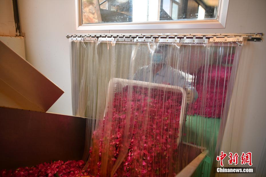 4月21日,云南省安宁市八街街道一玫瑰花加工厂内,工人将玫瑰花倒入机器进行筛选。近日,云南省安宁市八街街道的食用玫瑰进入采摘季,玫瑰花加工企业也开始逐渐忙碌。据了解,八街街道已建成食用玫瑰现代化生产标准化流水线10余条,主要生产玫瑰糖、玫瑰馅料、玫瑰鲜花饼、玫瑰香皂、玫瑰饮料等数十个品种,玫瑰花种植面积近万亩,年出产鲜花约4500吨,产值约6750万元,食用生产加工综合产值过亿元。中新社记者 刘冉阳 摄