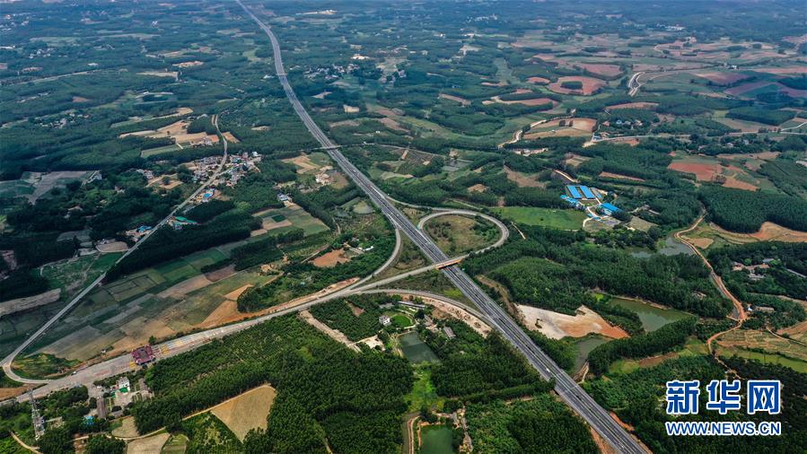 这是4月21日拍摄的合浦县境内的桂海高速公路(无人机照片)。 暮春时节,从空中俯瞰广西北海市合浦县大地,河流、稻田、虾塘、道路、村庄星罗棋布、色彩斑斓,美不胜收。 新华社记者 张爱林 摄