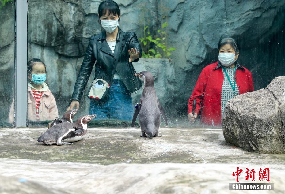 4月22日,游客隔着玻璃与企鹅互动。当日,武汉动物园恢复开放。疫情防控阶段每日限流1.5万人次,采取无接触的售票方式。园内露天动物场馆正常开放,大熊猫馆、河马馆、犀牛馆、狒狒馆等四个场馆仅开放室外区域。中新社记者 张畅 摄