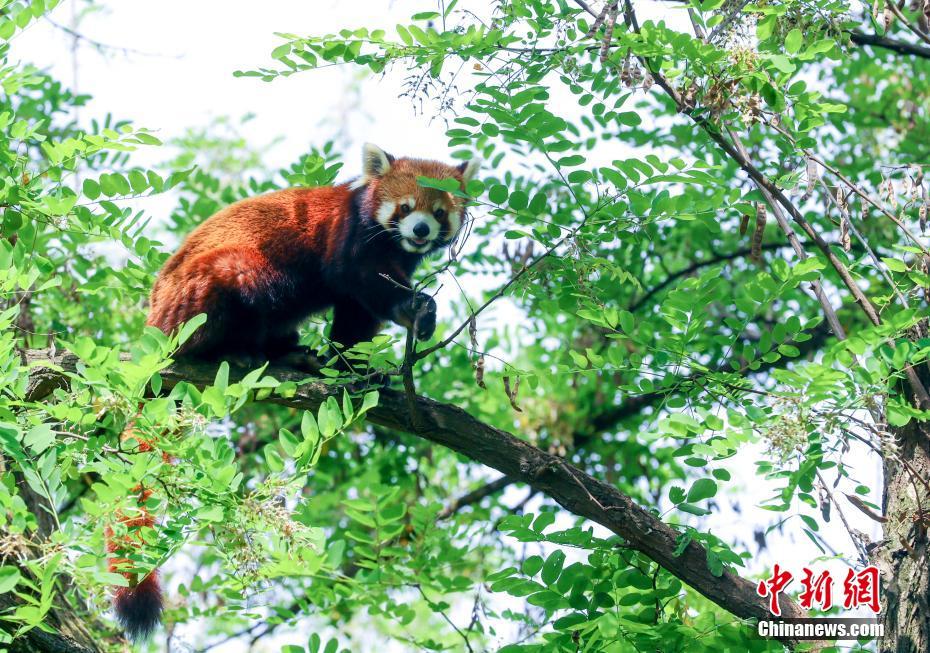 4月22日,小熊猫爬到室外的树上活动。当日,武汉动物园恢复开放。疫情防控阶段每日限流1.5万人次,采取无接触的售票方式。园内露天动物场馆正常开放,大熊猫馆、河马馆、犀牛馆、狒狒馆等四个场馆仅开放室外区域。中新社记者 张畅 摄