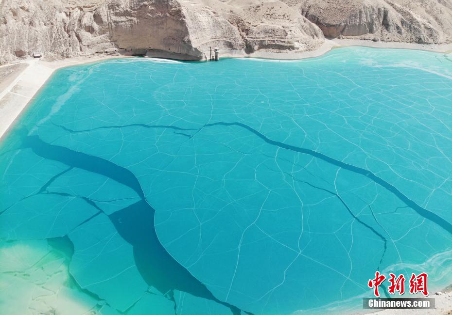 4月中旬航拍的祁连山脚下甘肃张掖市境内摆浪河水库,冰面在阳光折射下呈现出碧绿色,这和周围尚未返青而仍是荒原的山地形成鲜明的对比。中新社记者 杨艳敏 摄