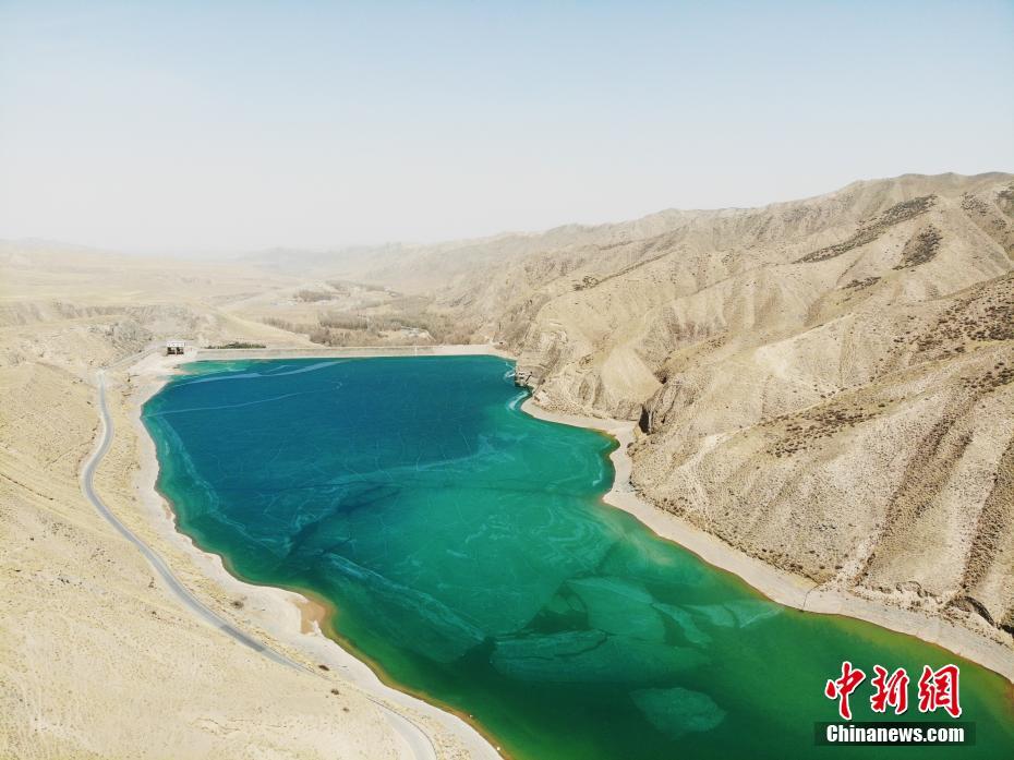 4月中旬航拍的祁连山脚下甘肃张掖市境内摆浪河水库,冰面在阳光折射下呈现出碧绿色,这和周围尚未返青而仍是荒原的山地形成鲜明的对比。中新社记者 杨艳敏 摄