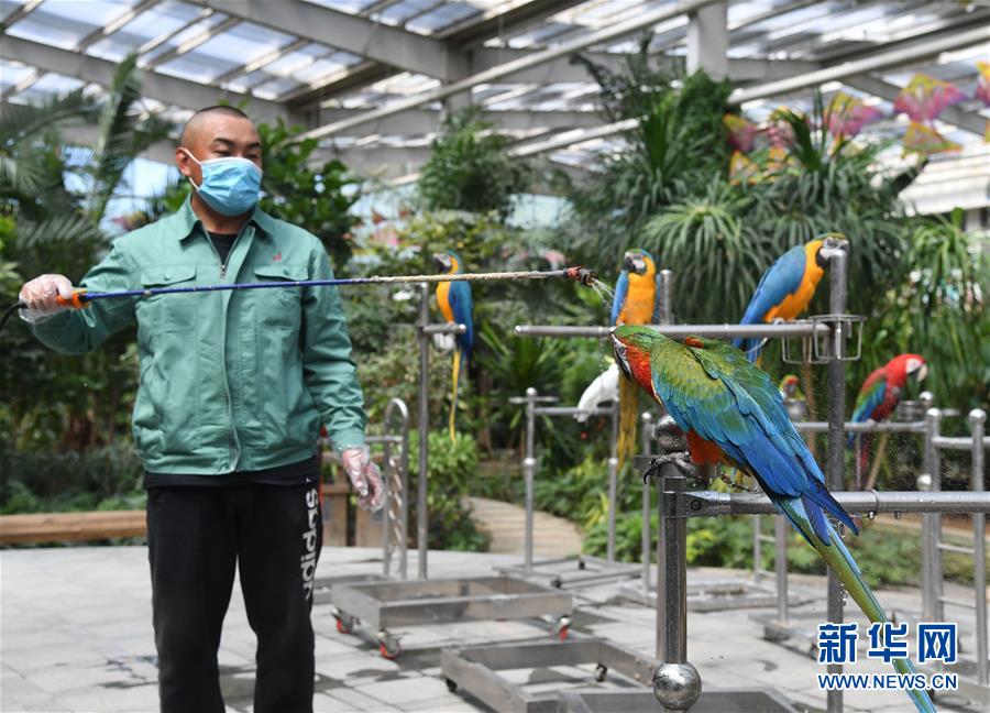 4月24日,在北京南宫五洲植物乐园鹦鹉园,工作人员通过喷洒水雾的方式让鹦鹉洗澡。 近期,随着天气逐渐转暖,位于北京市丰台区的北京南宫五洲植物乐园鹦鹉园在做好新冠肺炎疫情防控的前提下,通过增加鹦鹉洗澡次数、加强园内卫生清洁等方式,保障鹦鹉健康。据介绍,受新冠肺炎疫情影响,目前北京南宫五洲植物乐园鹦鹉园暂未对公众开放。 新华社记者 任超 摄