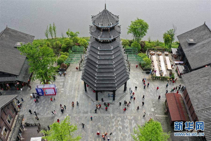 4月25日,游客在丹寨万达小镇游玩(无人机照片)。 当日,2020年贵州省促进旅游消费启动仪式在丹寨县的丹寨万达小镇举行。现场派发“百万旅游消费券”,供游客在丹寨万达小镇消费时使用,助力旅游业复苏。 新华社记者 欧东衢 摄