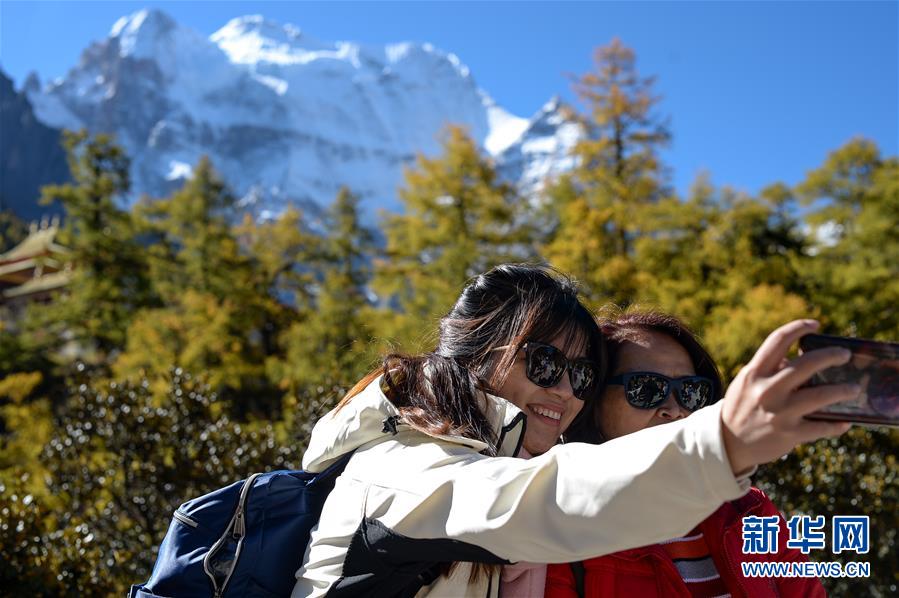 游客在亚丁景区内拍照合影(2019年10月20日摄)。新华社记者 唐文豪 摄