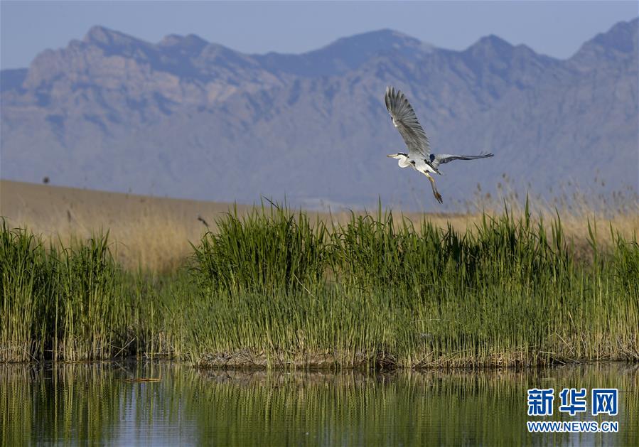 4月25日,一只苍鹭在沙湖景区芦苇丛上空飞翔。 位于宁夏石嘴山市平罗县境内的沙湖景区是候鸟的重要迁徙繁殖地之一,每年3月至10月间,众多候鸟在此栖息、繁衍。第九届沙湖国际观鸟节将于五一假期拉开帷幕,以“云端”观鸟的形式为游客带来新的体验。 新华社记者 冯开华 摄