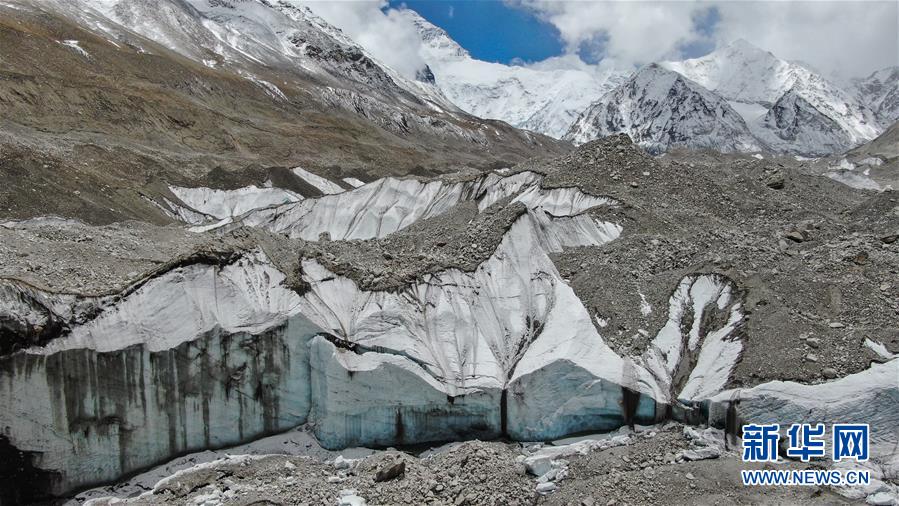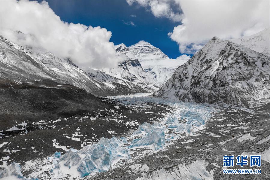 位于珠穆朗玛峰脚下海拔5400米左右的中绒布冰川(4月30日摄,无人机照片)。 位于珠穆朗玛峰脚下海拔5400米左右的中绒布冰川,巍峨壮观,冰塔林托起世界最高峰,让人叹为观止。 新华社记者 晋美多吉 摄