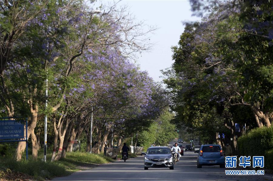 5月5日,在巴基斯坦伊斯兰堡,行人和车辆从蓝花楹树下经过。 新华社发(艾哈迈德·卡迈勒摄)