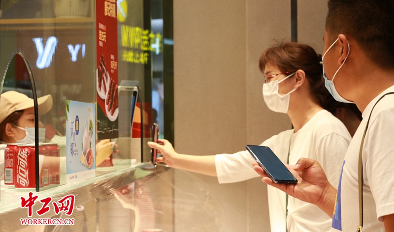 5月4日晚,顾客在武汉光谷步行街廖记棒棒鸡连锁销售点用手机付款。