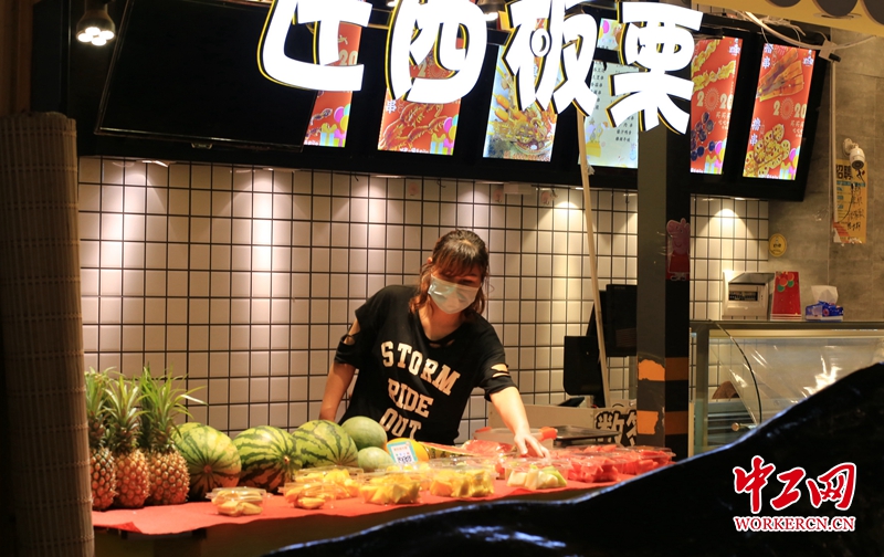 5月4日晚,武汉光谷步行街迁西板栗销售点,销售员在摆放水果。