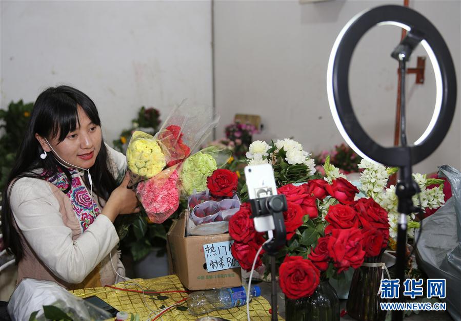5月4日,在昆明斗南花卉市场的一家公司,主播在推介鲜花。 “五一”假期,位于云南昆明的斗南花卉市场吸引不少市民和游客前来赏花、买花。 新华社发(梁志强 摄)