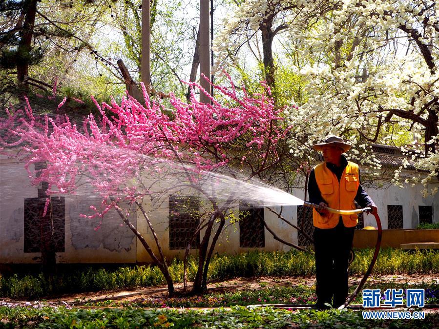 养护工人在西宁市园林植物园浇花(5月1日摄)。新华社记者 白玛央措 摄