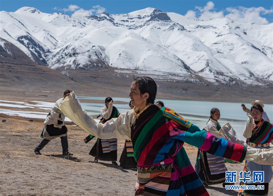 人们在西藏那曲市尼玛县当穹错旁举行的春耕典礼上唱歌跳舞(4月30日摄)。新华社记者 侯捷 摄