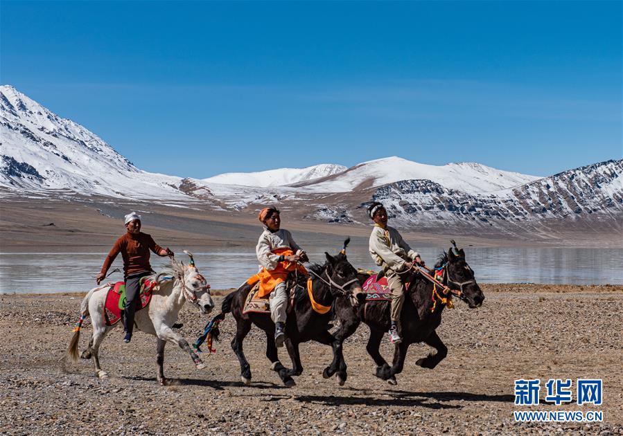 西藏那曲市尼玛县文部乡北村的村民们骑马在当穹错旁角逐(4月30日摄)。 新华社记者 侯捷 摄