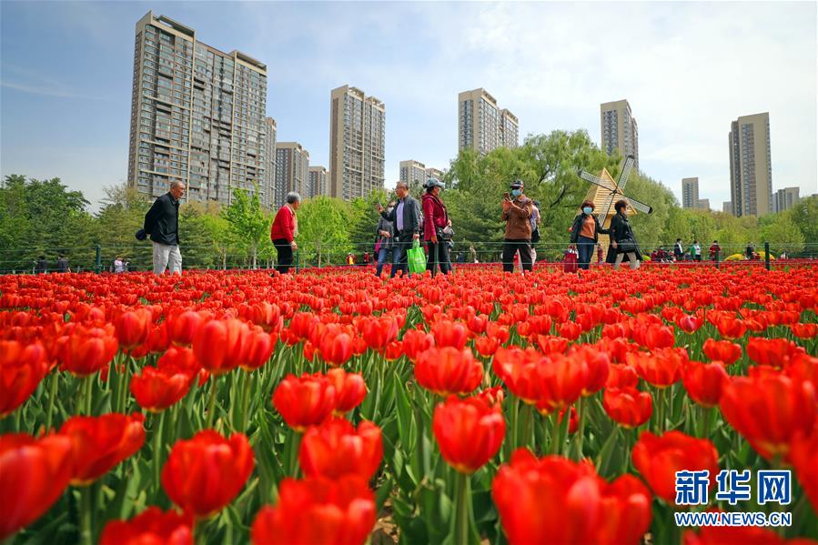 5月7日,市民在沈阳市和平区沈水湾公园赏花游玩。 近日,在沈阳市和平区沈水湾公园,成片的郁金香竞相开放,吸引众多市民赏花游玩。 新华社记者 杨青 摄