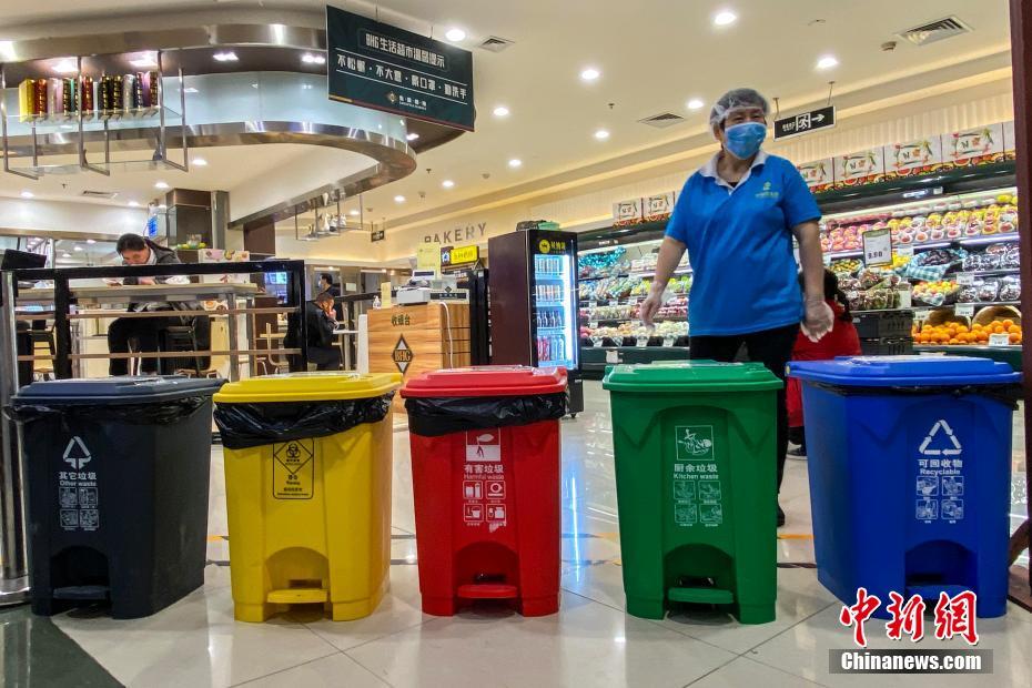 5月8日,北京西城区,一家商场入口处设置的分类垃圾桶十分醒目。5月1日开始,新修订的《北京市生活垃圾管理条例》正式实施,古老京城开启了垃圾分类新时代。中新社记者 张兴龙 摄