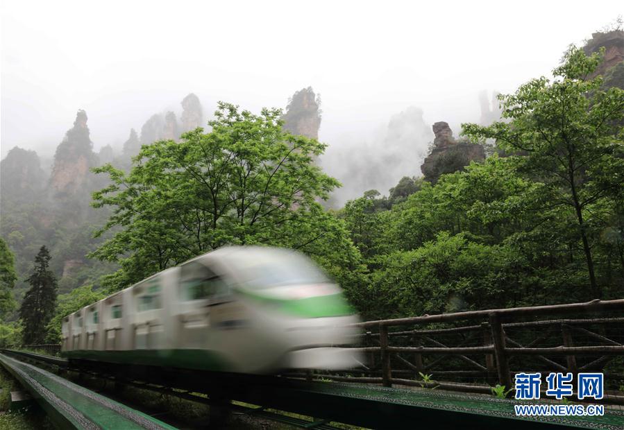 5月8日,观光电车行驶在湖南张家界武陵源景区十里画廊。 当日,湖南张家界武陵源景区十里画廊细雨朦胧、绿意盎然,峰林间云雾缭绕,美如仙境。穿梭往来的观光电车和游客点缀其间,绘出一道“流动”的风景。 新华社发(吴勇兵 摄)