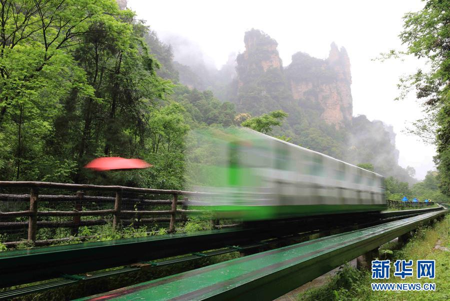 5月8日,观光电车行驶在湖南张家界武陵源景区十里画廊。 当日,湖南张家界武陵源景区十里画廊细雨朦胧、绿意盎然,峰林间云雾缭绕,美如仙境。穿梭往来的观光电车和游客点缀其间,绘出一道“流动”的风景。 新华社发(吴勇兵 摄)