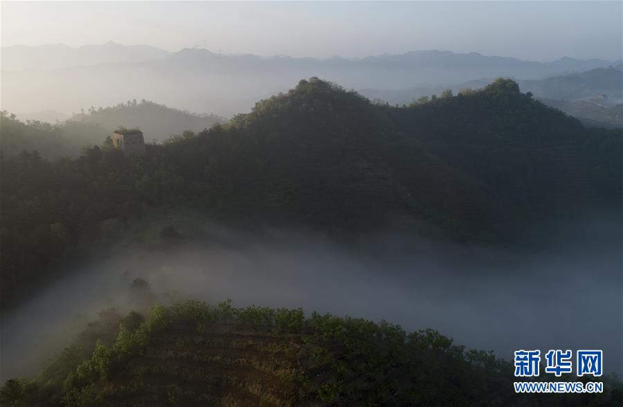 这是5月9日拍摄的河北遵化市境内的洪山口长城(无人机照片)。 当日清晨,河北省遵化市境内的长城云雾缭绕,美景如画。 新华社记者 杨世尧 摄