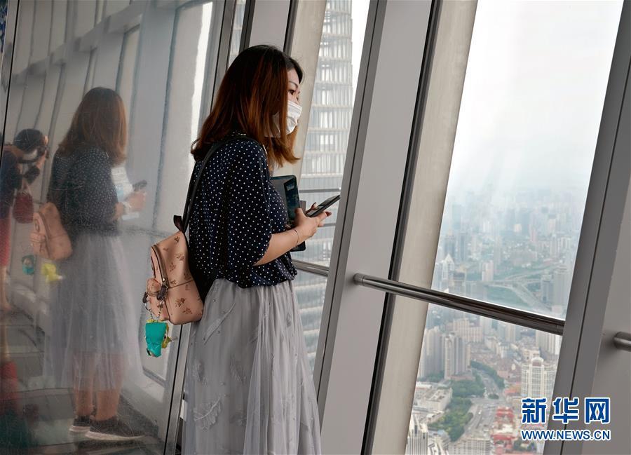 5月15日,游客在恢复开放的上海环球金融中心观光厅欣赏上海景色。 当日,因疫情于1月下旬关闭的上海环球金融中心观光厅恢复营业。恢复开放期间,上海环球金融中心观光厅调整了电梯载客人数和游客通道,采用新的实名制购票系统,并采取体温测量、人数限流、定时消毒等防疫举措。