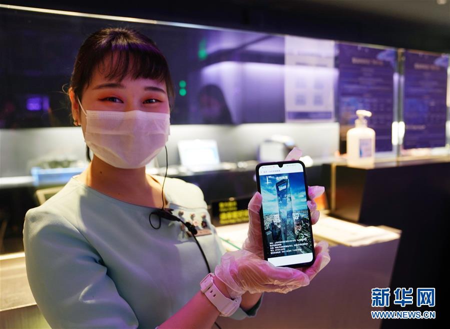 5月15日,上海环球金融中心观光厅的工作人员展示全新启用的线上实名制购票系统。 当日,因疫情于1月下旬关闭的上海环球金融中心观光厅恢复营业。恢复开放期间,上海环球金融中心观光厅调整了电梯载客人数和游客通道,采用新的实名制购票系统,并采取体温测量、人数限流、定时消毒等防疫举措。