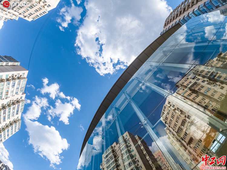 2020年5月27日,北京再续蓝天白云的好天气,城市建筑、住宅楼房等在天空云团衬托下,格外美丽,时尚楼宇镜面映出天空朵朵白云,超炫酷。(本组图片来源东方IC,版权作品,请勿转载。)