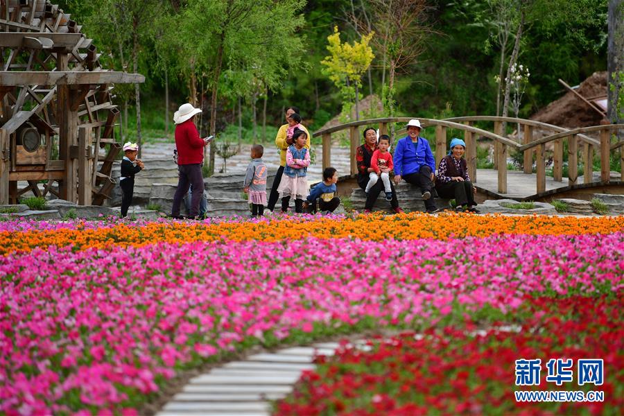 5月28日,村民在甘南藏族自治州临潭县八角镇牙扎村的花海景点休憩。